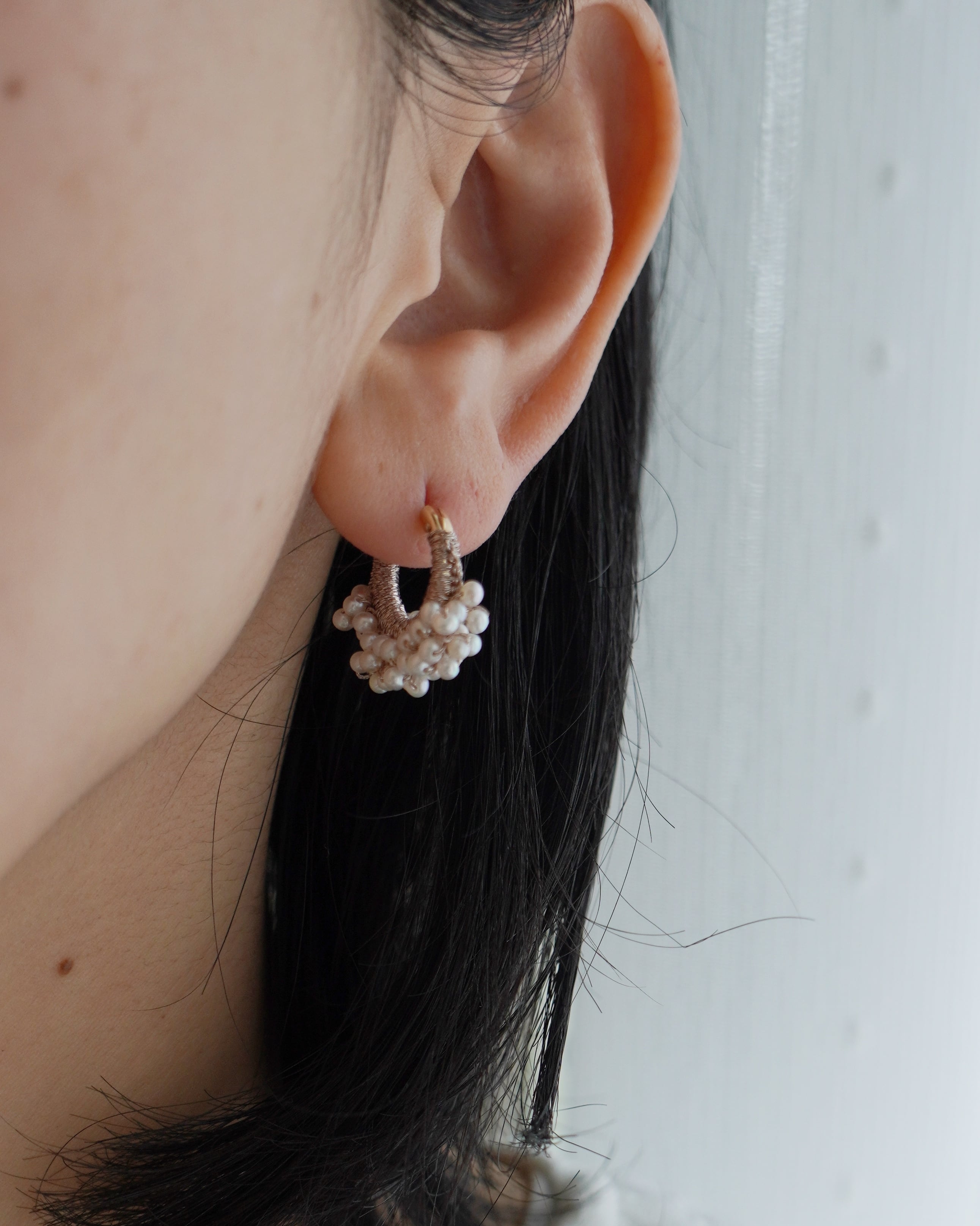 【14kgf】淡水パールフープピアスは、上品な輝きを放つ淡水パールをあしらったフープデザインのピアスです。小さな淡水パールが金糸で丁寧に編みつけられており、耳元で華やかな印象を与えながらも、品格を感じさせるアイテムです。