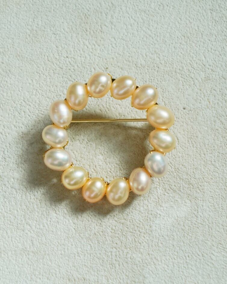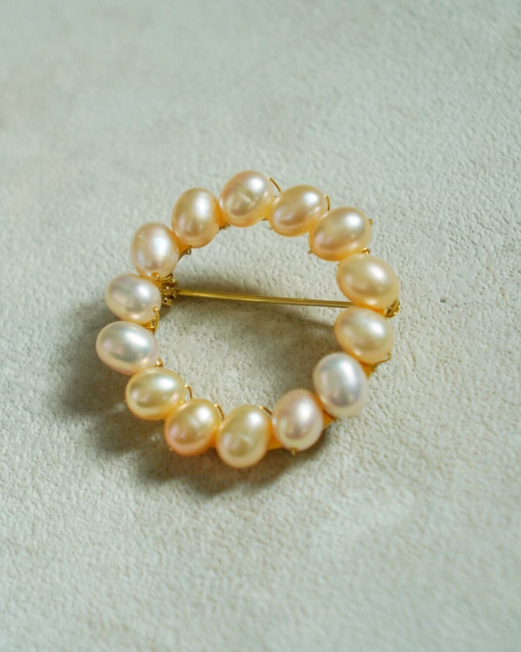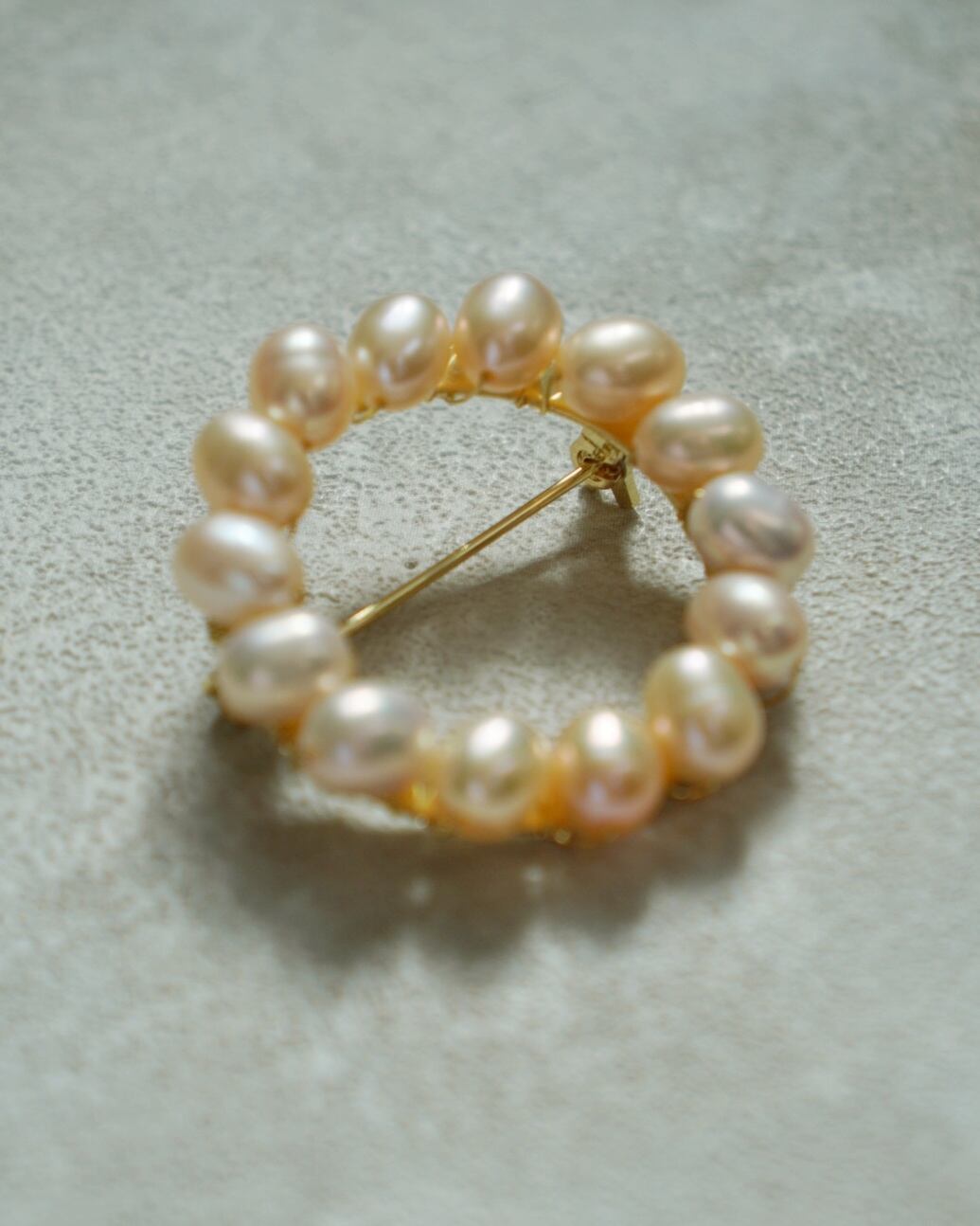天然色のピンクパールをサークル状に仕立てたこのアイテムは、華やかさと上品さを兼ね備えています。