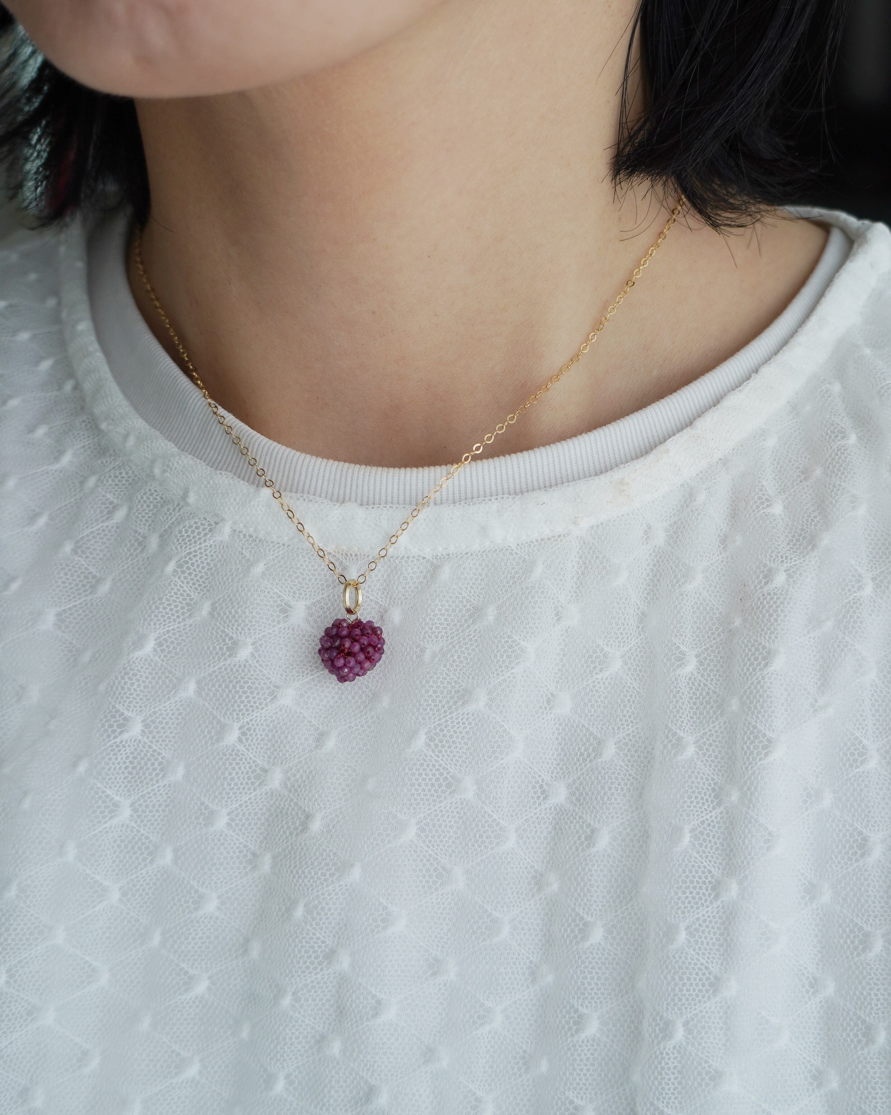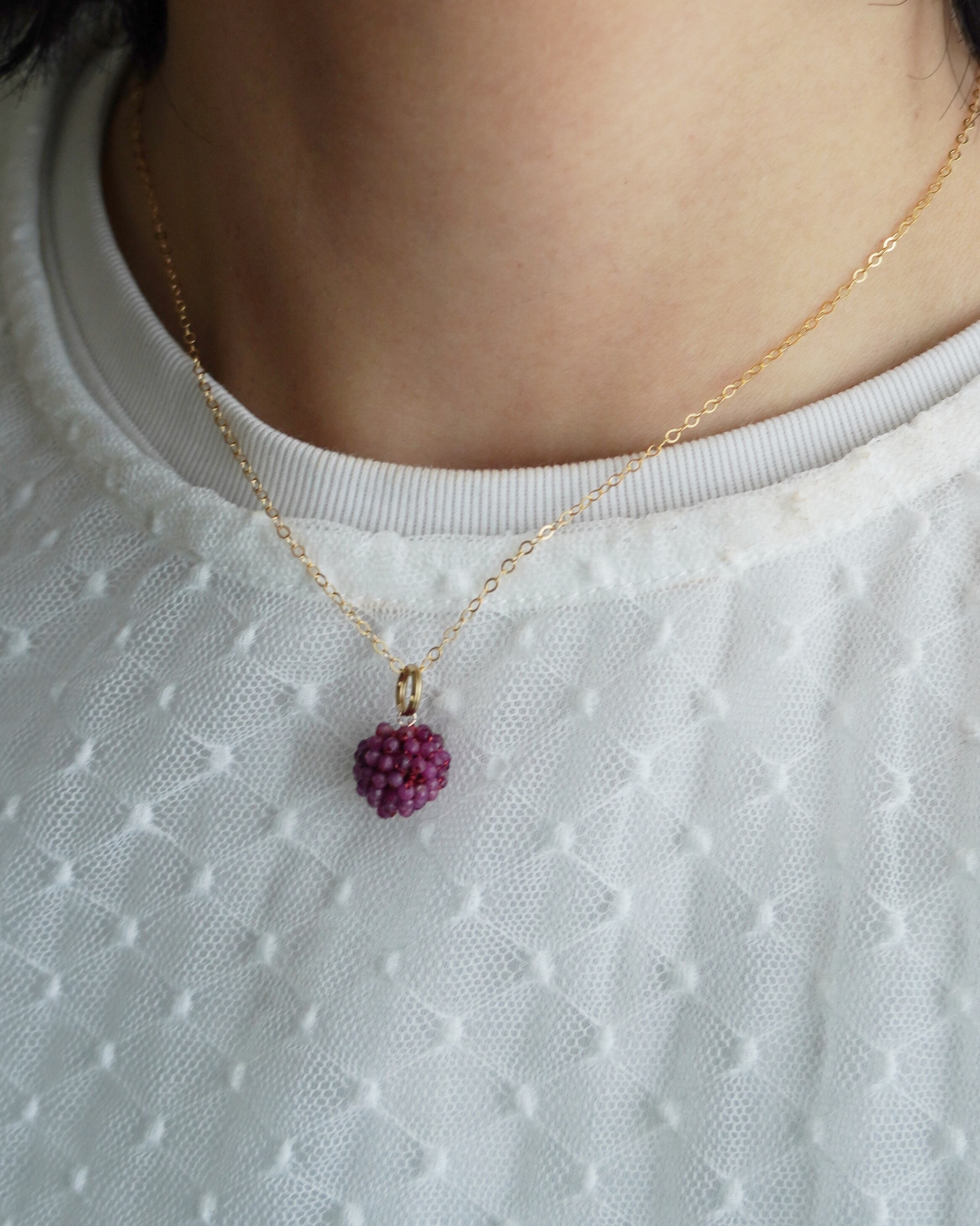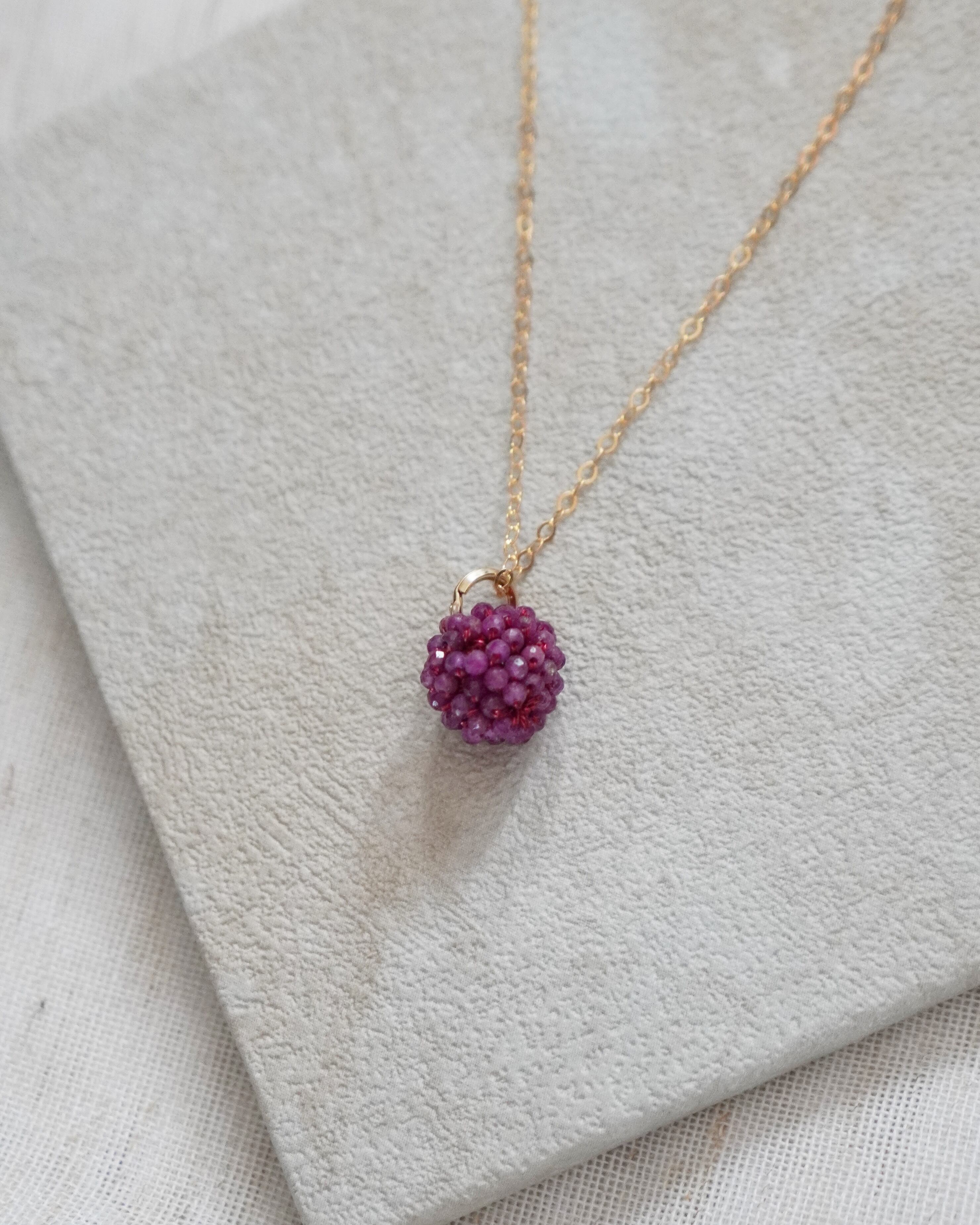 ルビーの極小ビーズをていねいにボール状に編みました