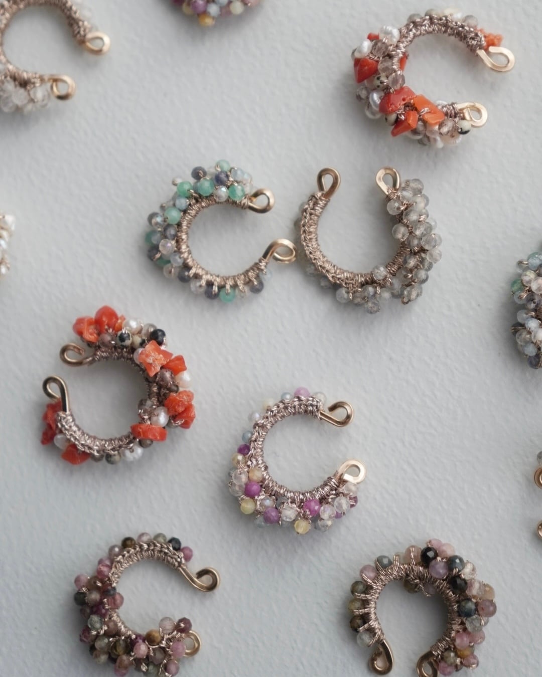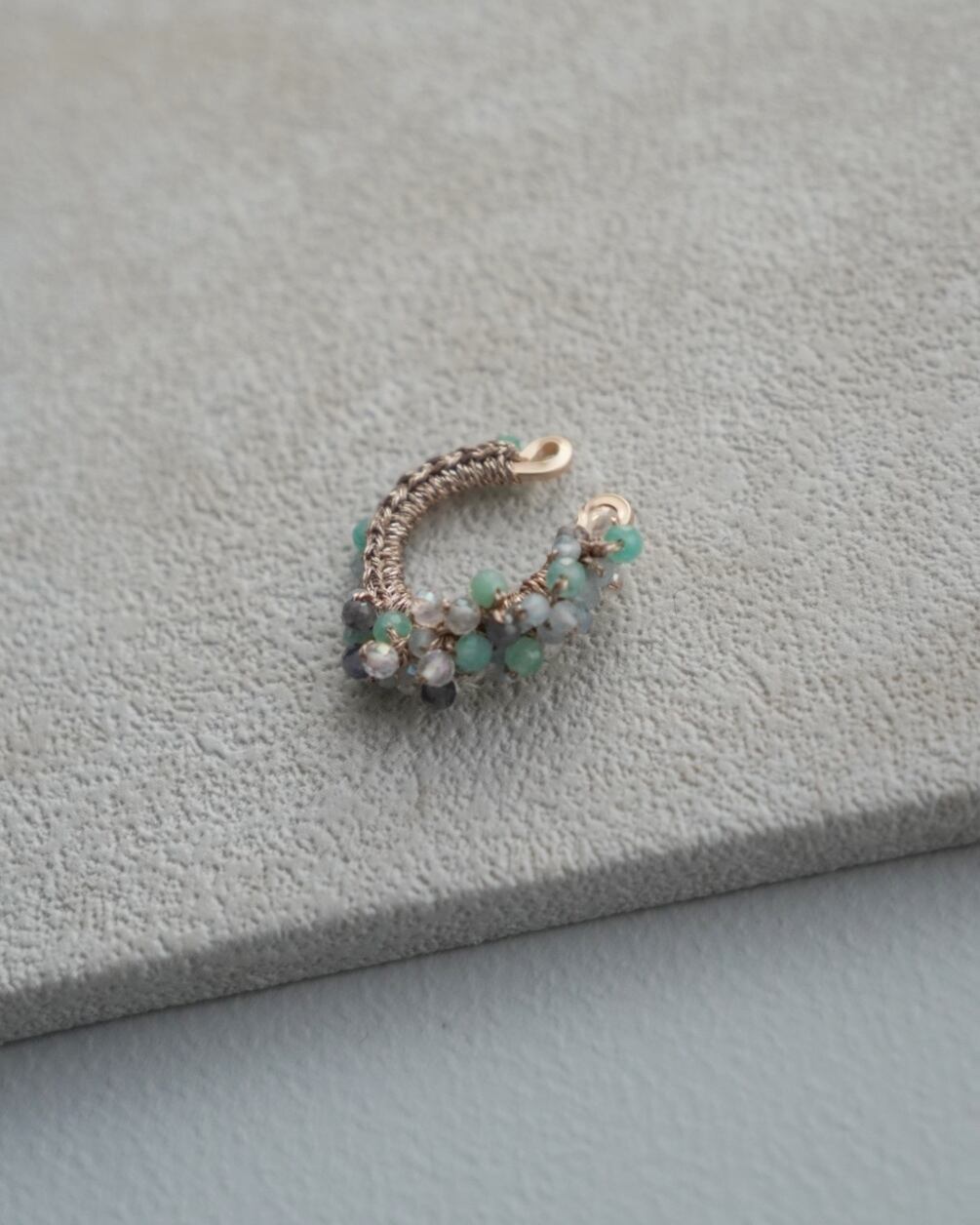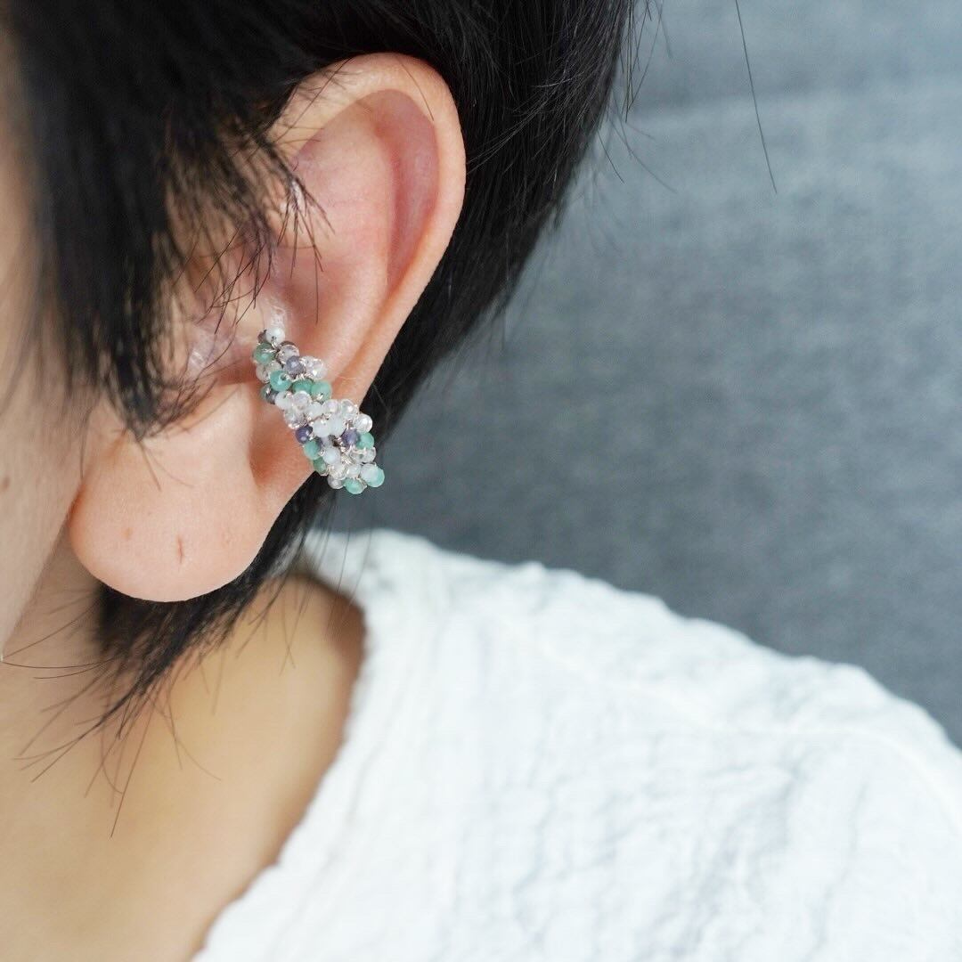 エメラルドを中心に、様々な天然石を編んだアシンメトリーイヤーカフは、繊細かつユニークなデザインが特徴のアクセサリーです。