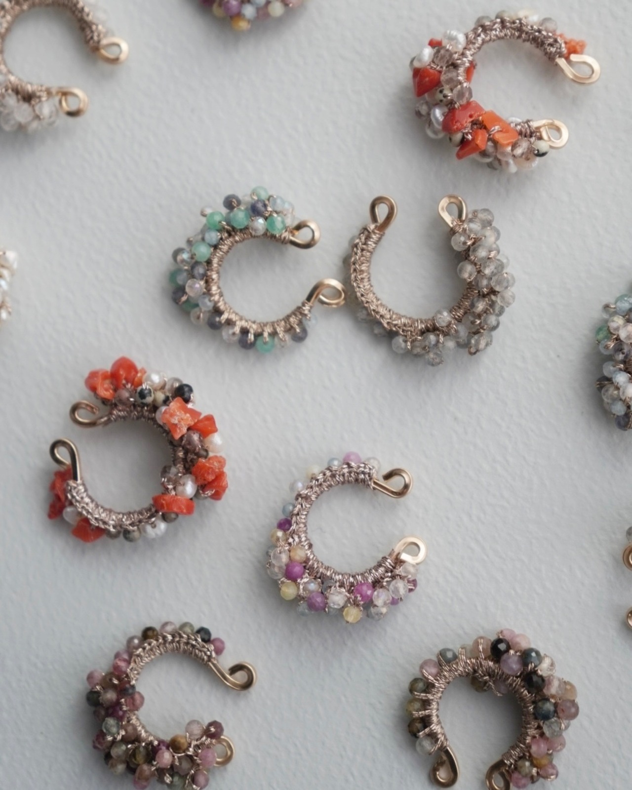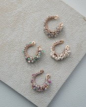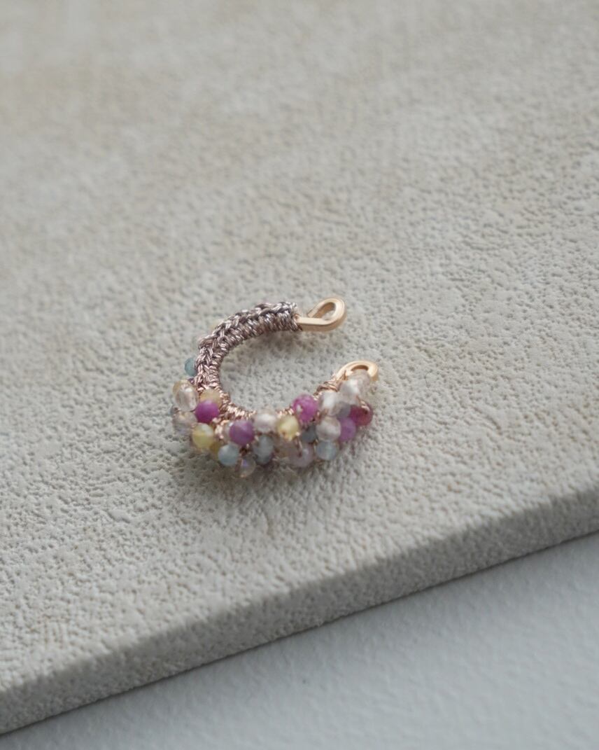 ピンクサファイアを中心に、様々な天然石を編んだアシンメトリーイヤーカフは、繊細かつユニークなデザインが特徴のアクセサリーです。
