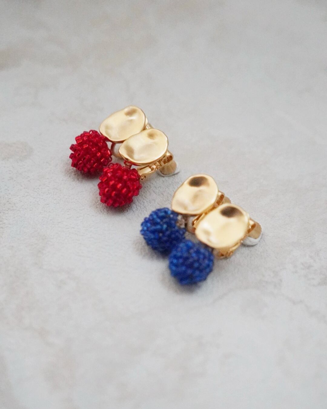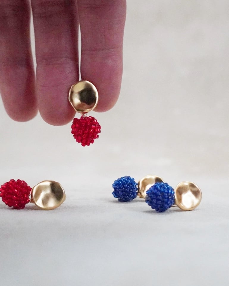 赤いガラスビーズを編んでボール状に仕立てたピアスは、華やかでありながら上品な印象を与えるアクセサリーです。