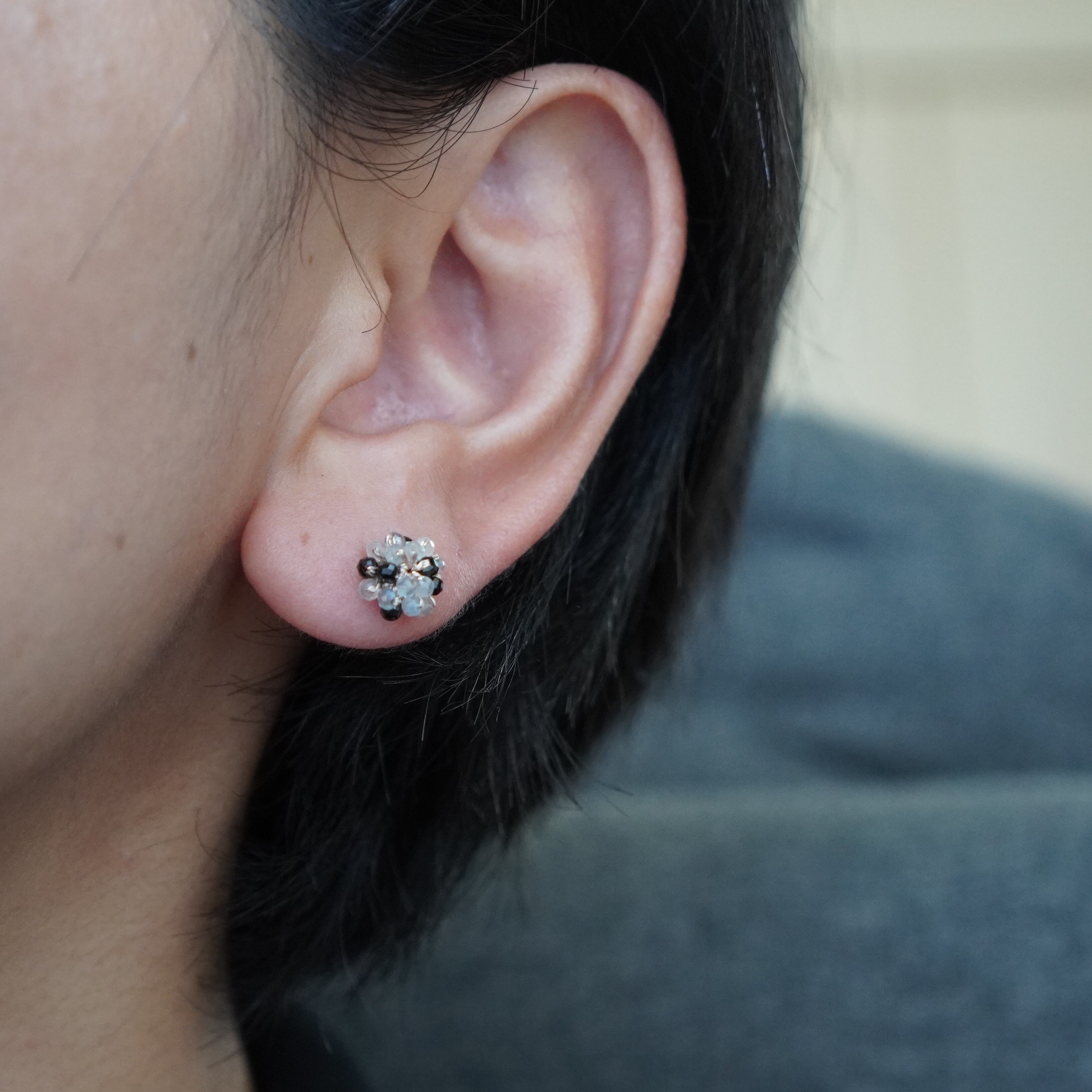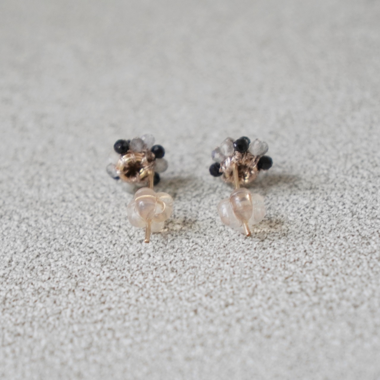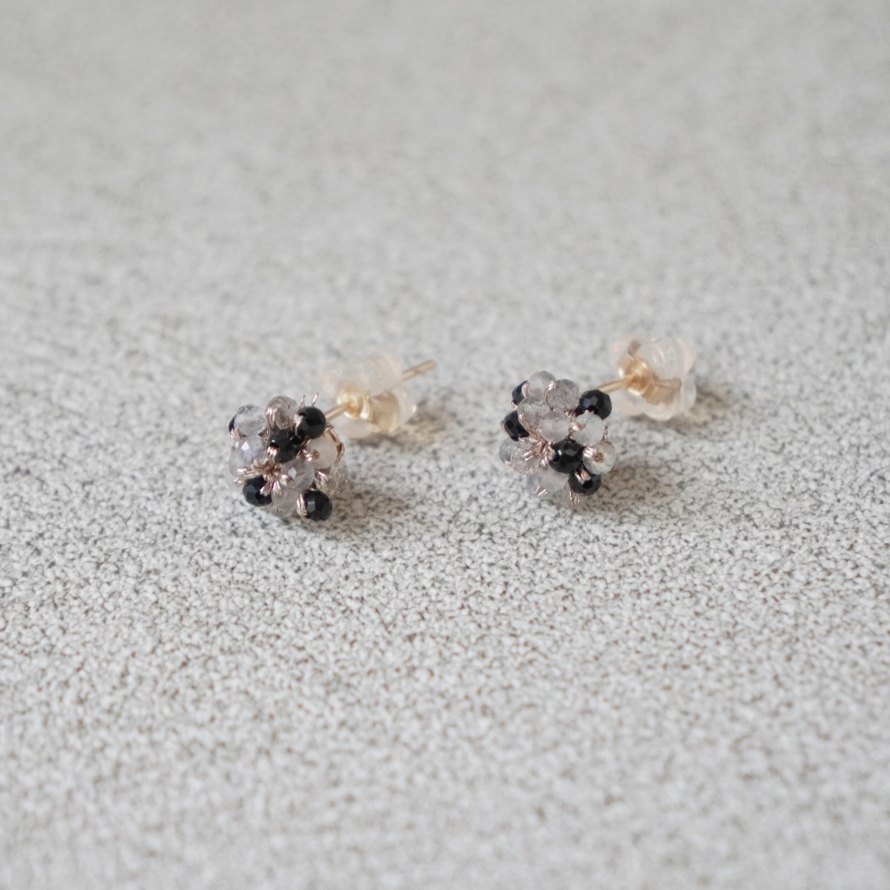 ブラックスピネルとムーンストーンをふんだんに使ったつぶつぶデザインのピアス。魅惑的なカットが施された2mmの極小ブラックスピネルと、その美しさを引き立てるムーンストーンが絶妙に組み合わさったアイテムです。