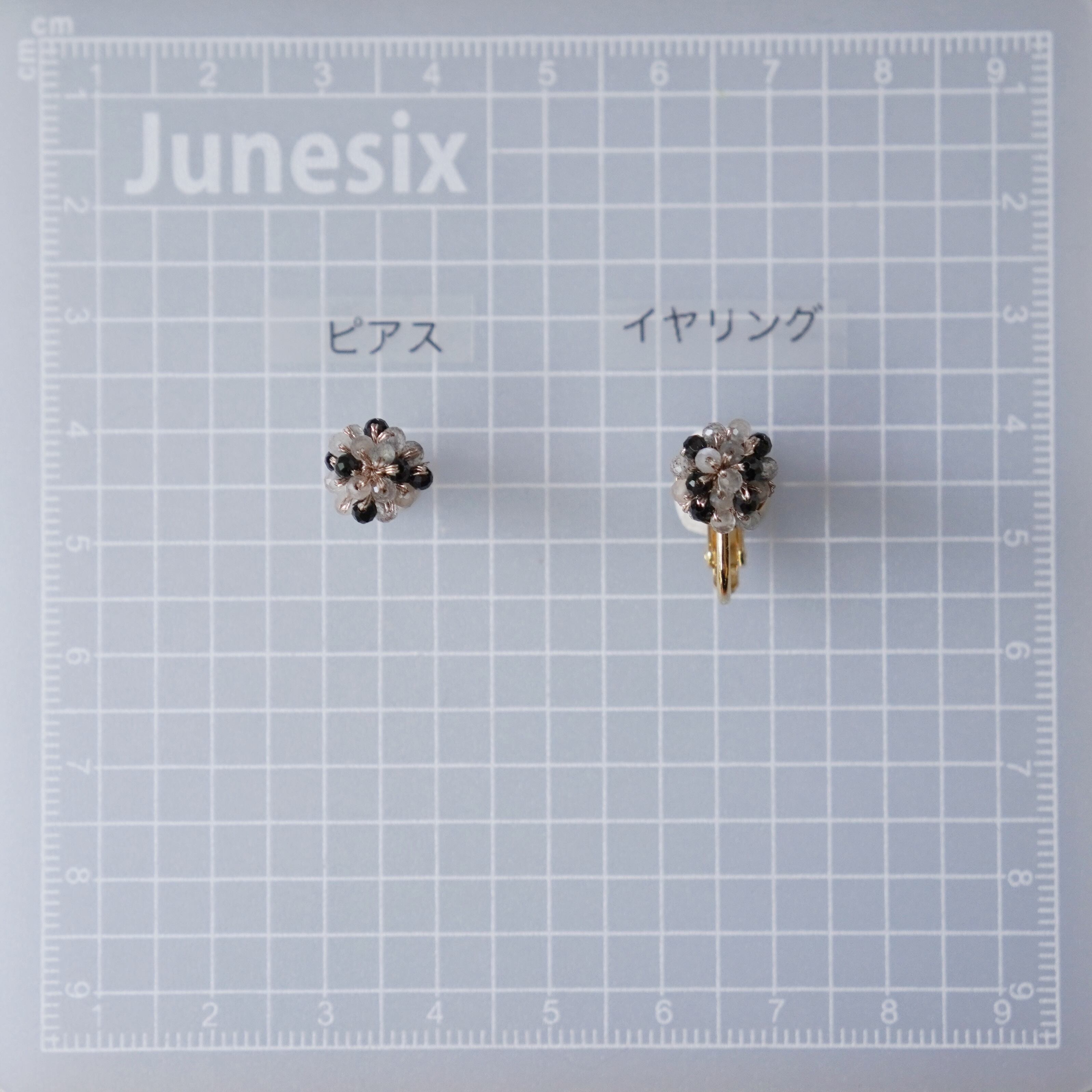 モノトーンカラーの小粒のピアスなので、だんなシーンでも耳元をキラリと引き立てます。
