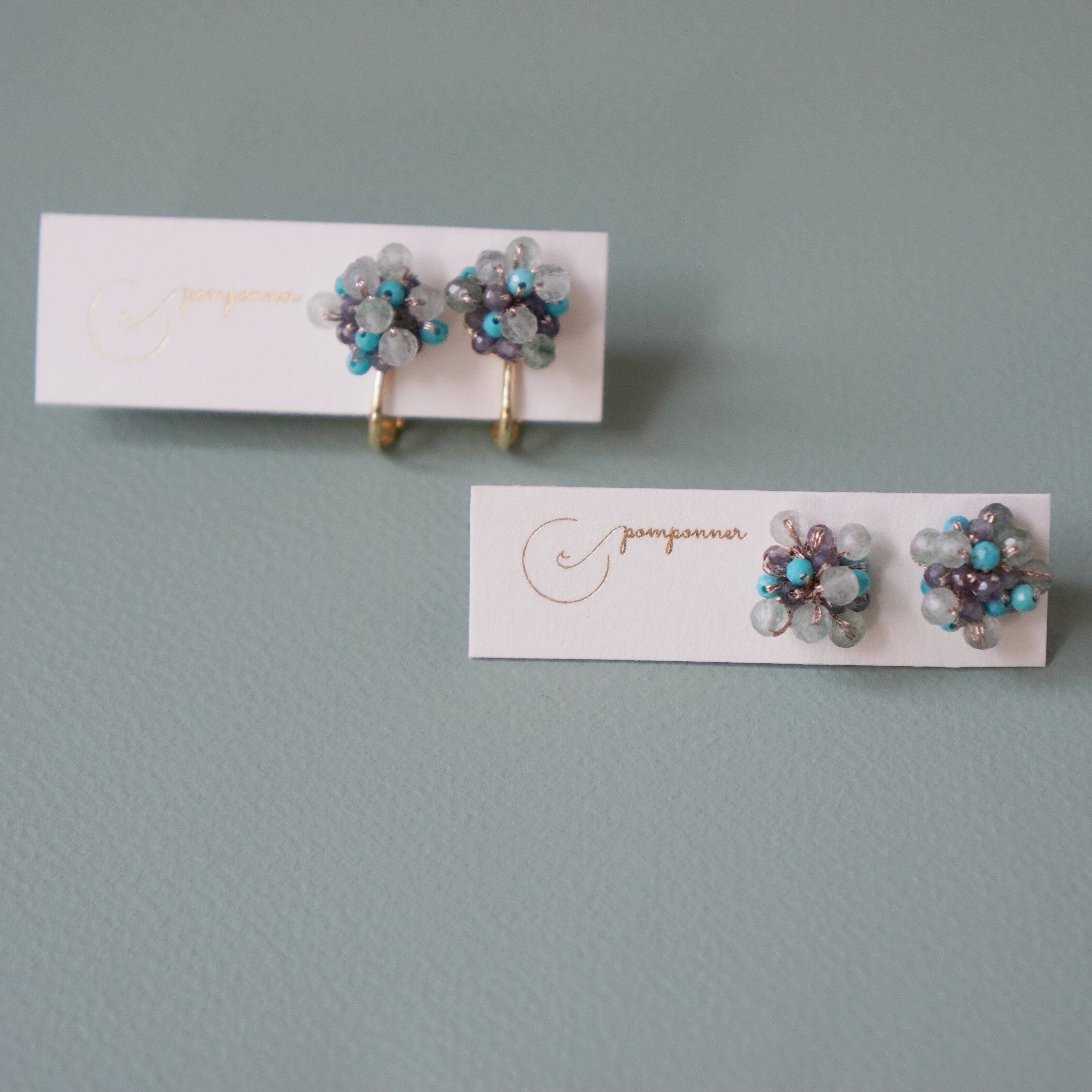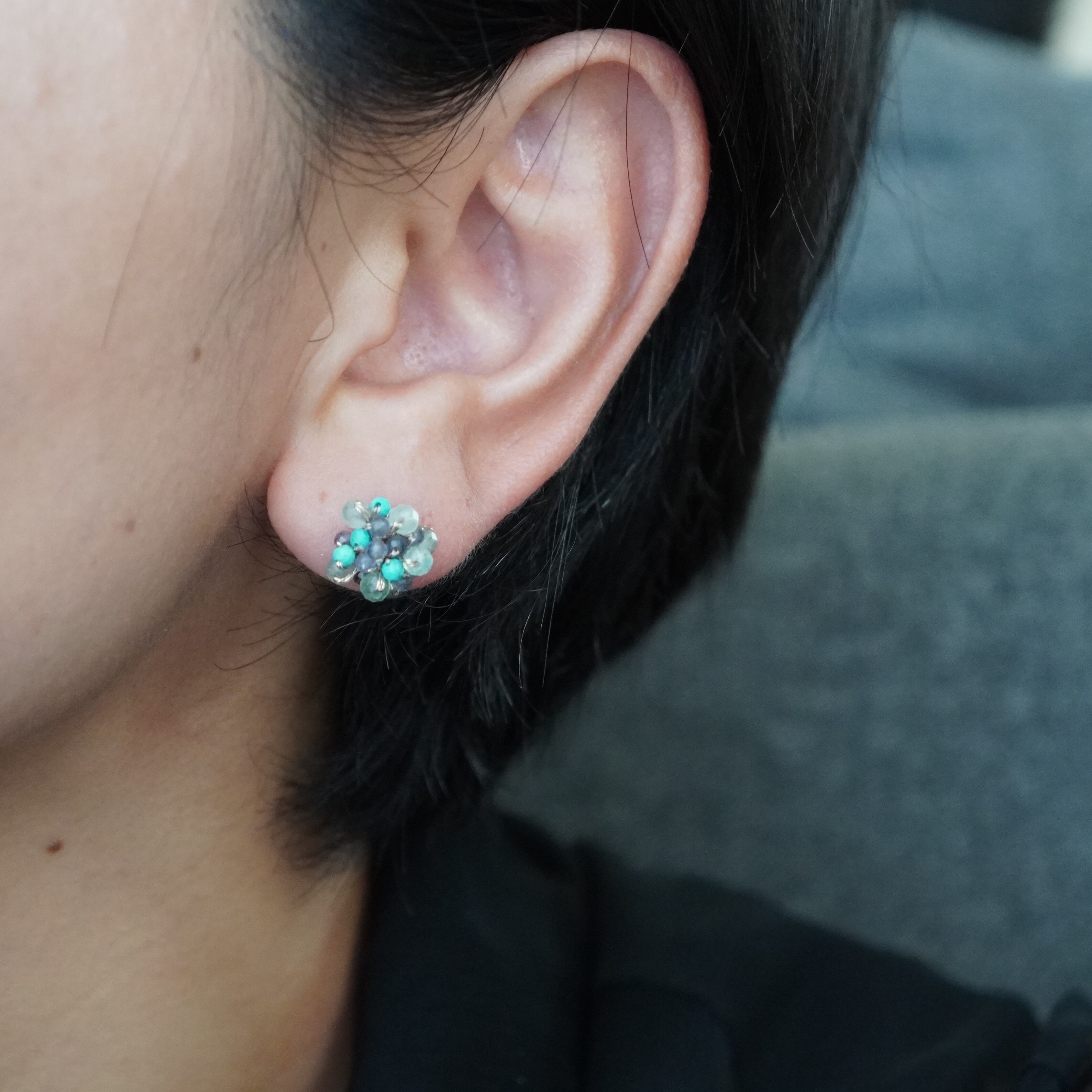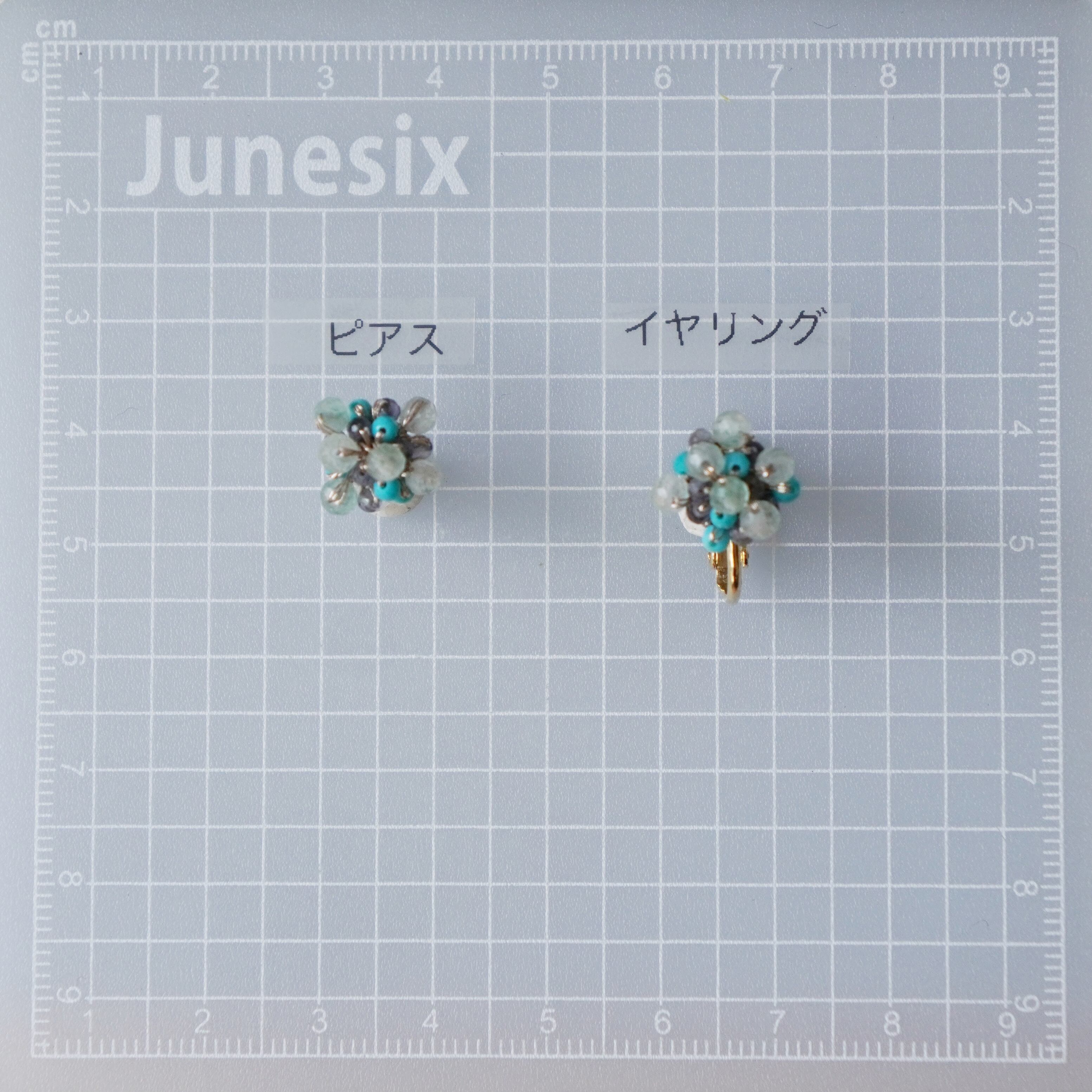 キングマンターコイズとアイオライトの天然石ビーズが煌めく、つぶつぶピアス。希少価値の高いキングマン鉱山で採掘されたターコイズは、色合いが鮮やかで耳元を華やかに彩ります。