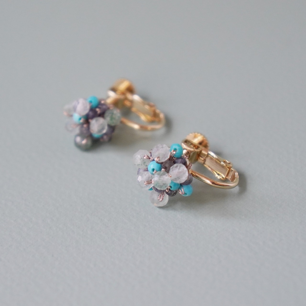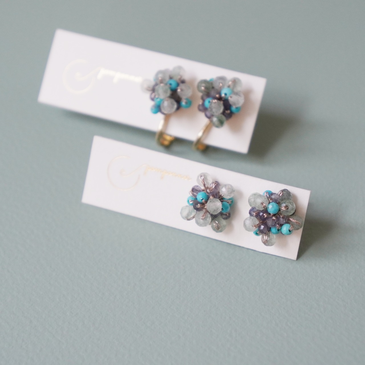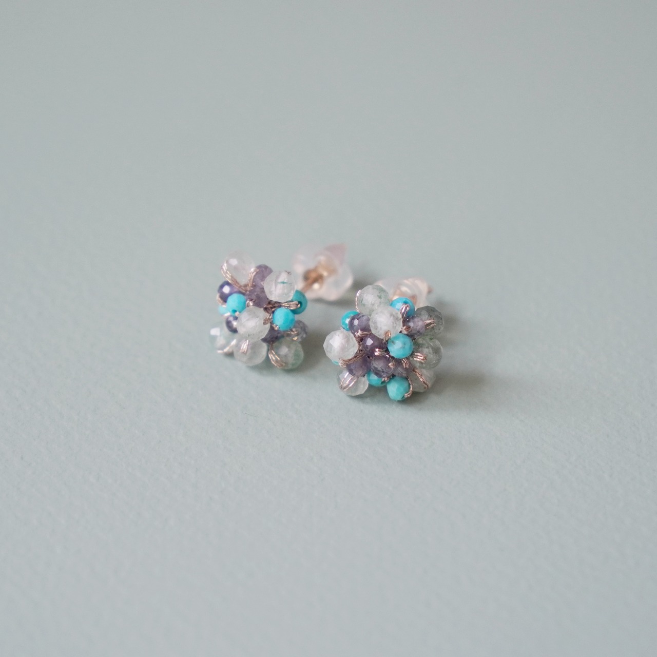 キングマンターコイズとアイオライトの天然石ビーズが煌めく、つぶつぶピアス。希少価値の高いキングマン鉱山で採掘されたターコイズは、色合いが鮮やかで耳元を華やかに彩ります。